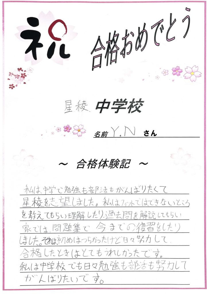 【星稜中学校合格! 東金沢駅前校 Y.N.さん】