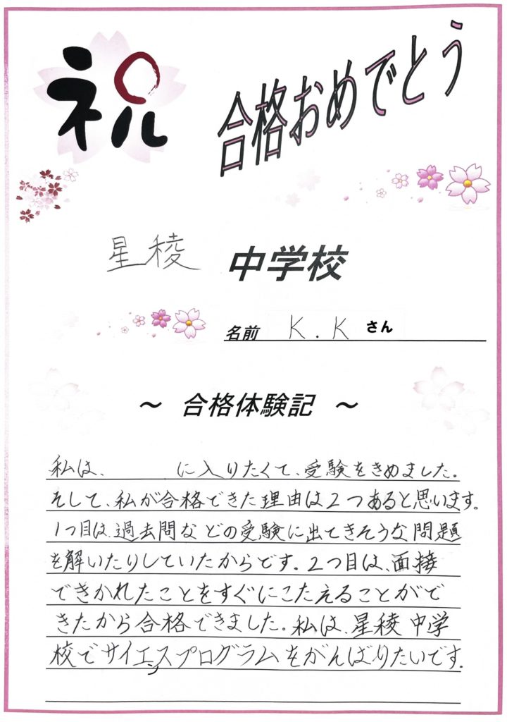 【星稜中学校合格! 東金沢駅前校 K.K.さん】