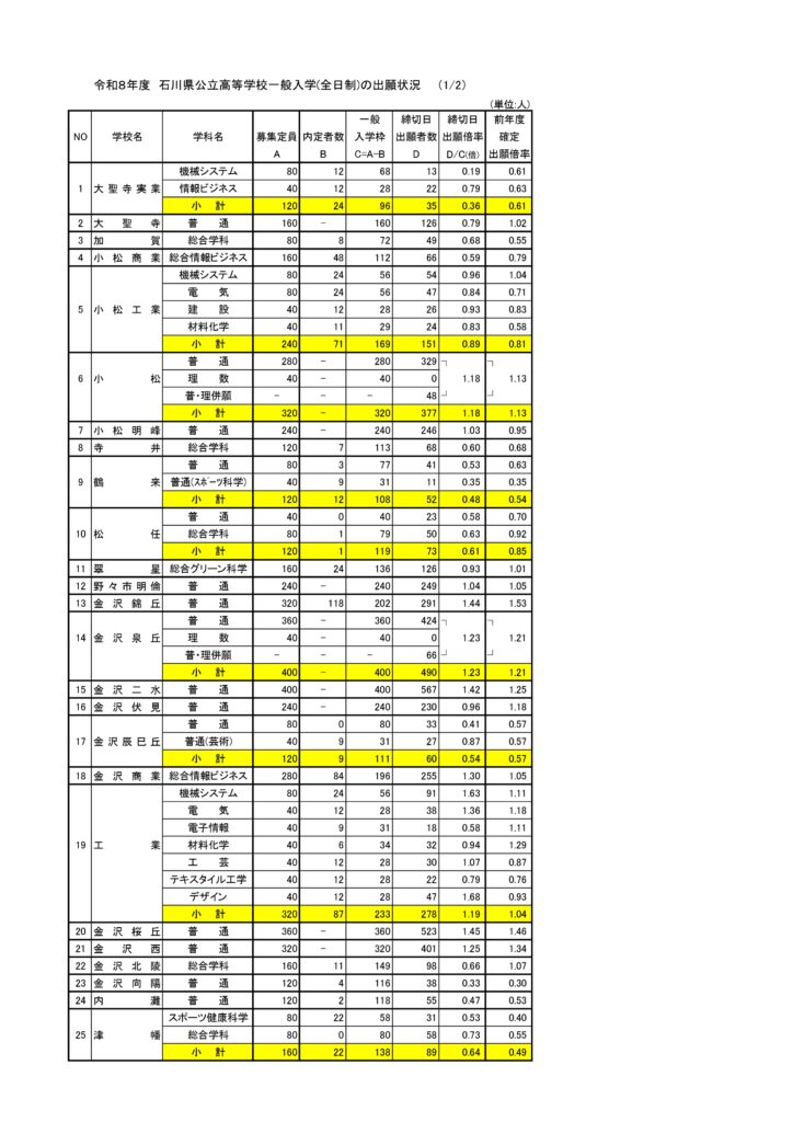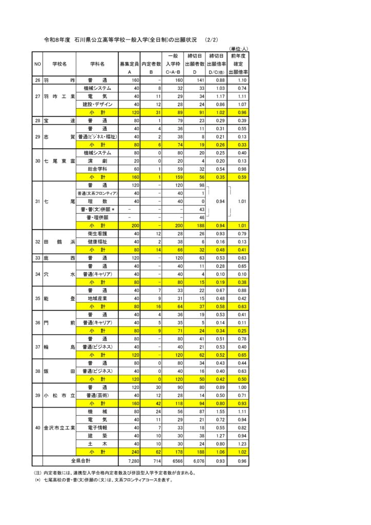 令和8年度石川県公立高校入試出願倍率(全日制)2月24日状況