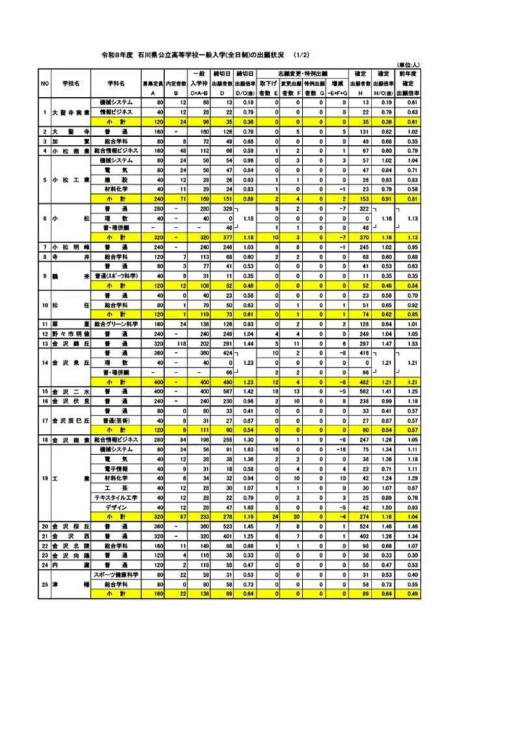 令和8年度石川県公立高校入試 確定出願倍率(全日制)